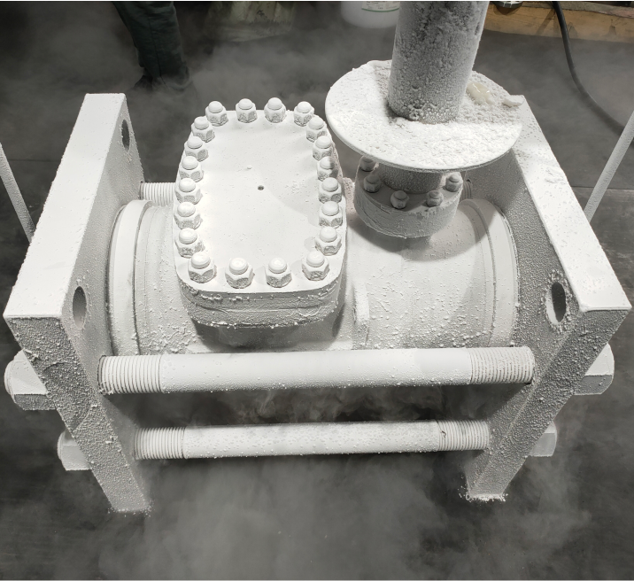 閥門低溫試驗溫度分為-39℃~-40℃,-196℃~-50℃等范圍。在-39℃~-40℃時,冷卻介質為干冰和酒精的混合物,在-196℃~-50℃時,冷卻介質為酒精和液氮的混合物或純液氮。試驗介質可以為氮氣、純氮或99%的氮氣混合1%的氦氣(用來檢測泄漏)。